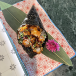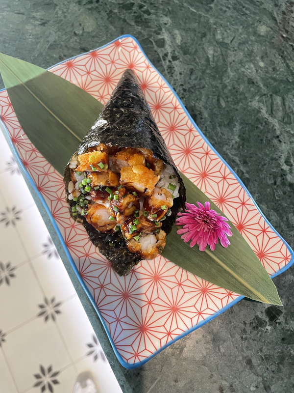 Arroz, carangueijo tempura, mayonese japonesa e ovos tobiko.