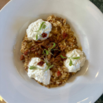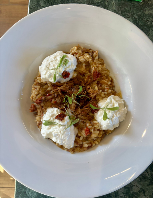Arroz de risoto, carne de osso buco , tomate seco, queijo parmegiano e straciatella de burrata.